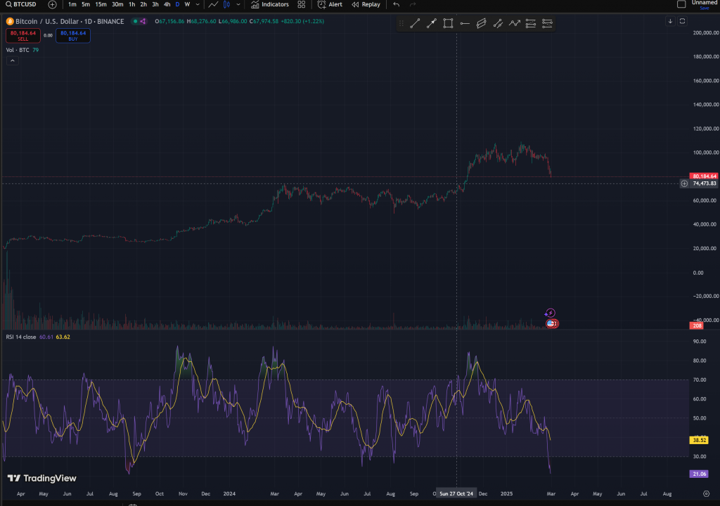 Chỉ báo kỹ thuật như RSI (Relative Strength Index) ở mức 38,66 cho thấy Bitcoin đang ở vùng quá bán, nhưng đà giảm vẫn chưa dừng lại. Các bài phân tích trên X cảnh báo rằng nếu không giữ được mức hỗ trợ 80.000 USD, giá có thể giảm tiếp xuống 70.000–75.000 USD.